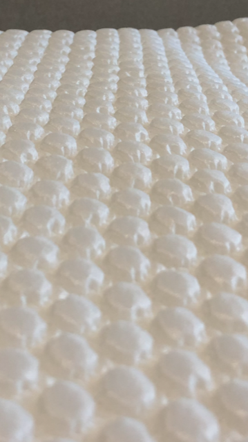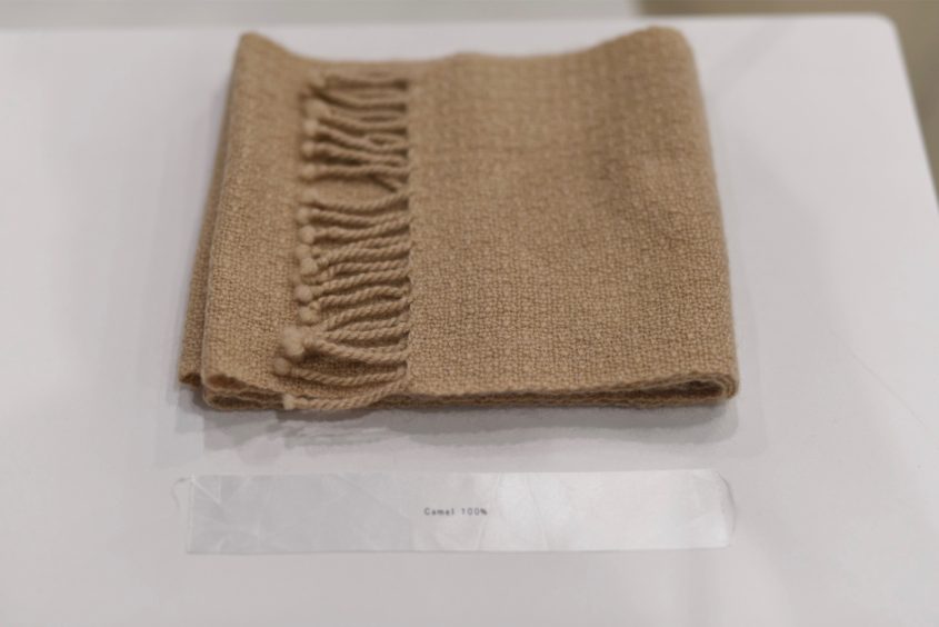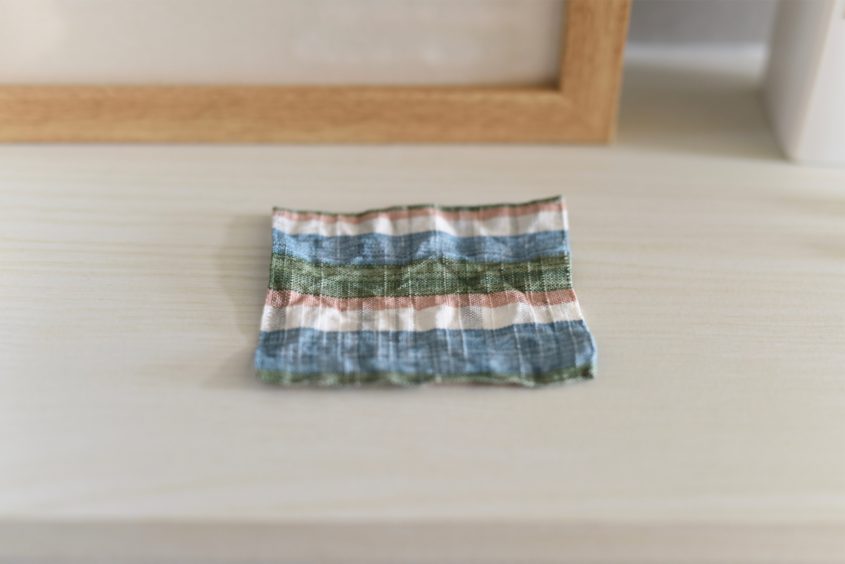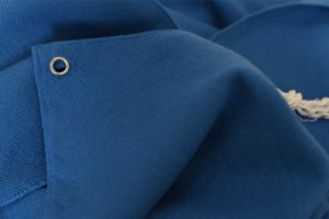 ヒツジの繊維を使い、ブルーシートを再現しました。あえて上質な繊維のみを撚り合せた太糸をつくり、ざくざくと密に織り合わせ、最終工程で圧力をかけて光らせています。