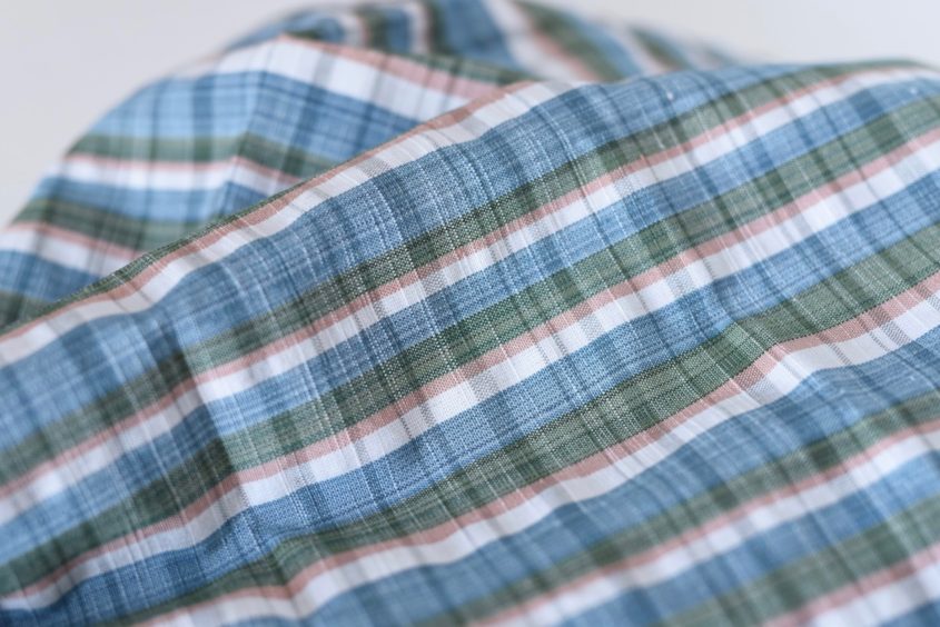 ハスの糸の風合いを表面にだしながら、甘く熟した果実を思わせる潤いのあるシルクをあまく織り込むことで、例えようのない、やわらかくしっとりとしたファブリックに。