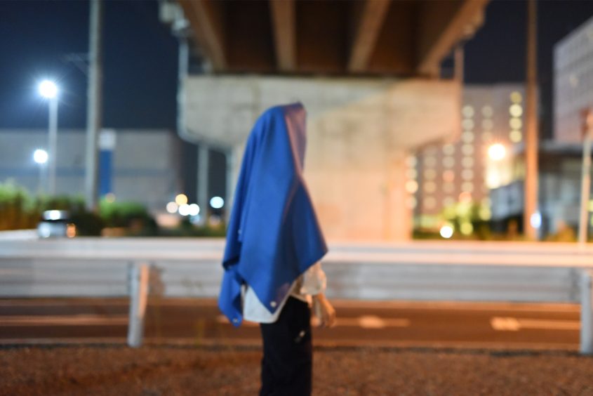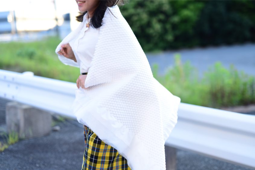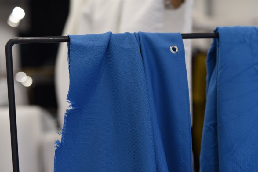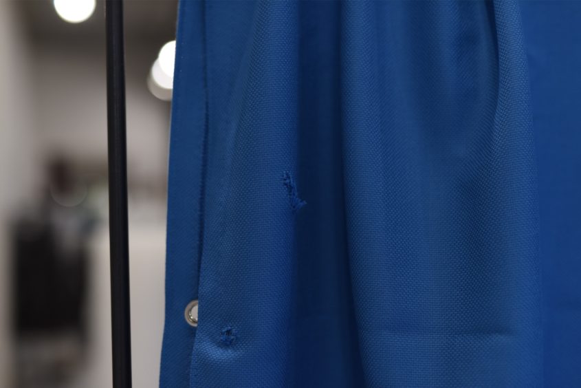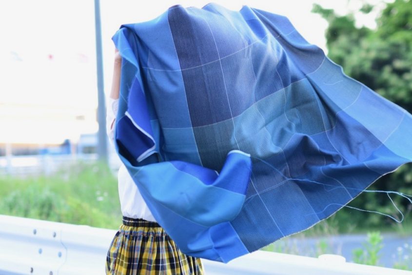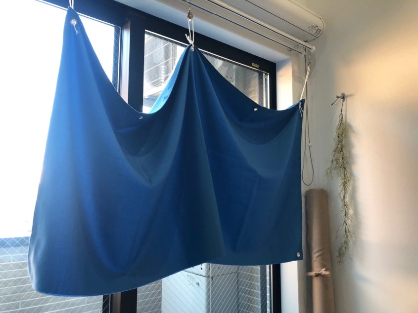 惹き込まれるような光沢を放つブルー。本物のブルーシートとは違う質感の、やわらかく垂れる生地には心が動かされます。
